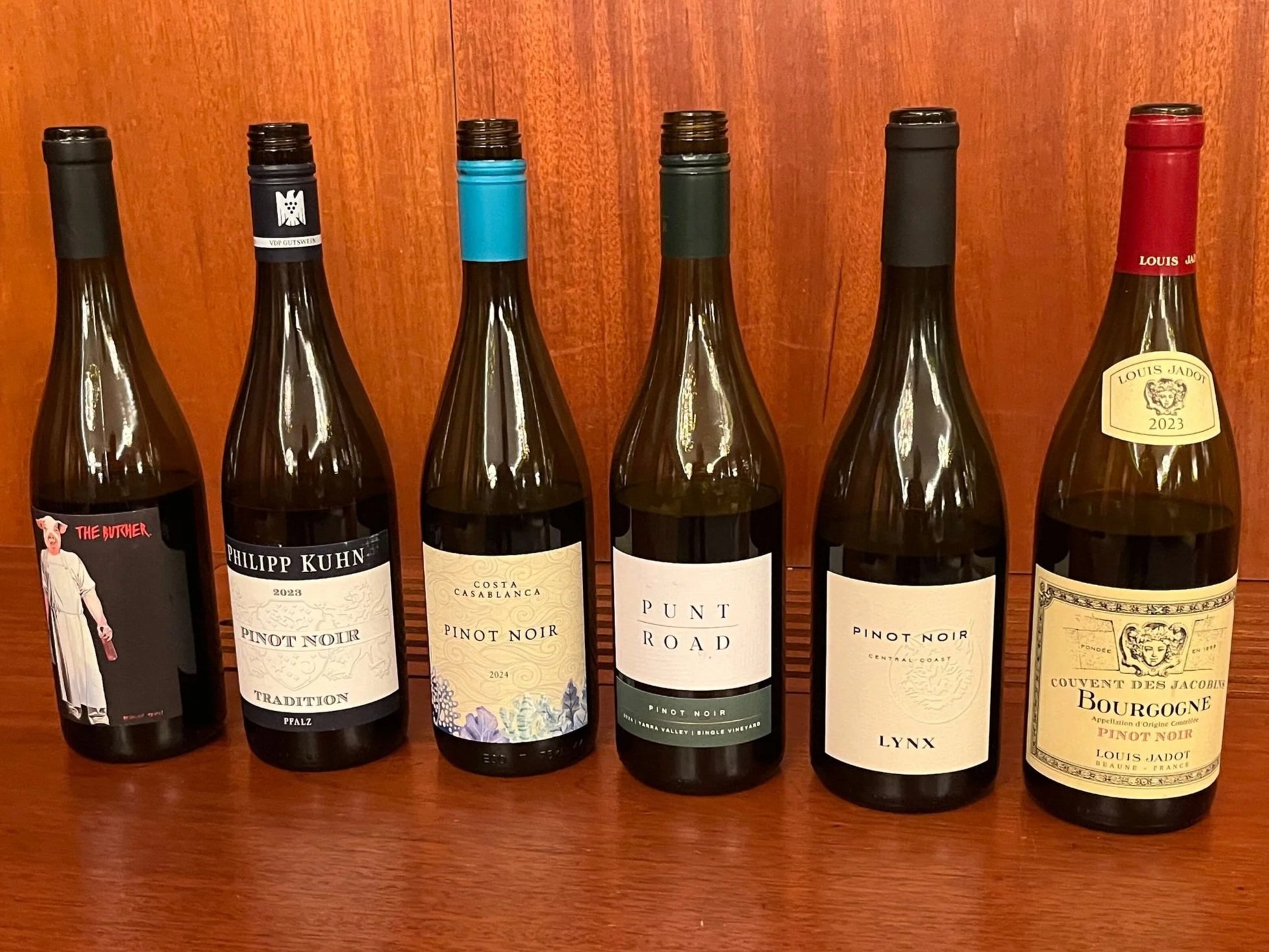 Sex olika pino noir flaskor ifrån lika många länder testades