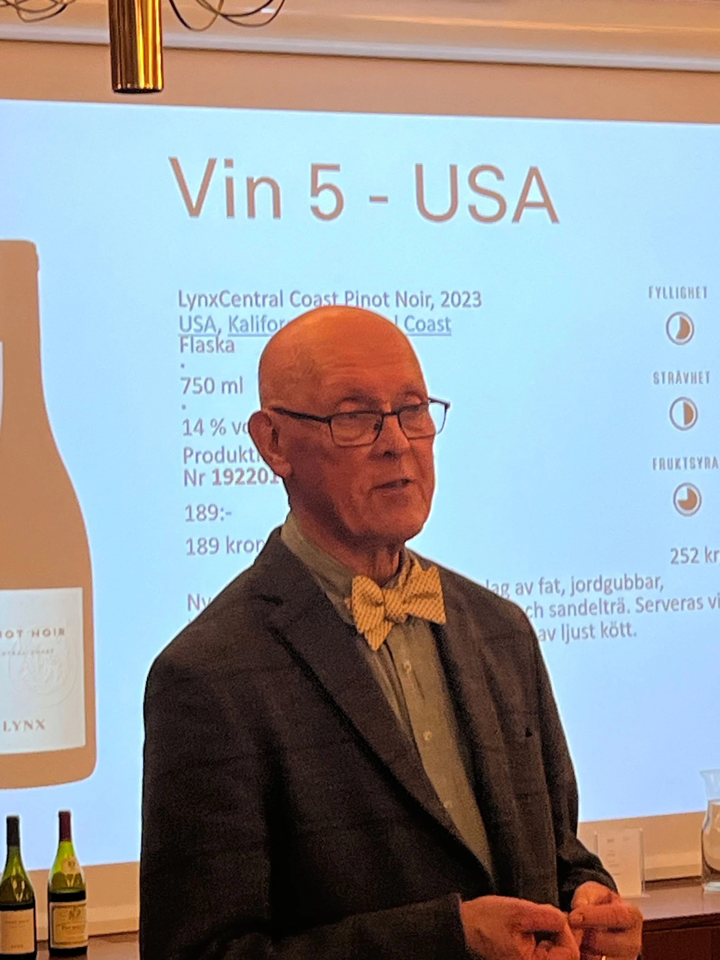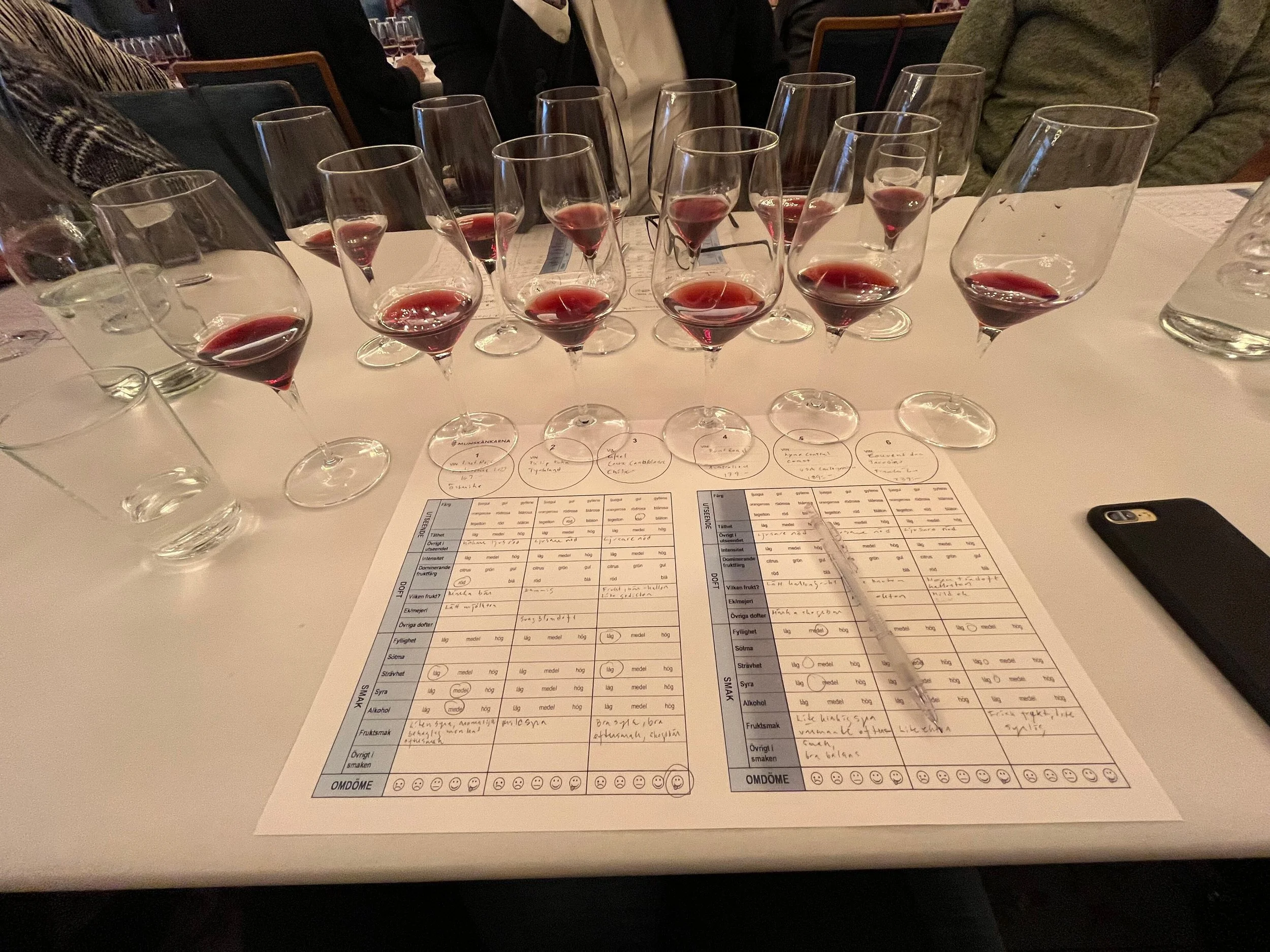 Drygt 30 anmälda vägleddes av provningsledare Thomas Lindholm genom sex olika viner. Provningen baserades på temat druvan Pinot Noir från olika länder och producenter. På en av bilderna hittar du vinerna på bild. Provningen genomfördes i raskt tempo med korta teoridelar från Thomas. I en kort paus bjödsdeltagarna på en Cava baserad på Pinot Noir från Spanien. Åter tillbaka i provningsrummet så bjöds på en aperetivo och italiensktvin alternativt att deltagarna sparat röd Pinot Noir i glasen för att hitta en personlig favorit. Det gav möjlighet att ytterligare fundera kring personliga favoriter och hur de matchade charkuterierna.